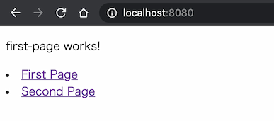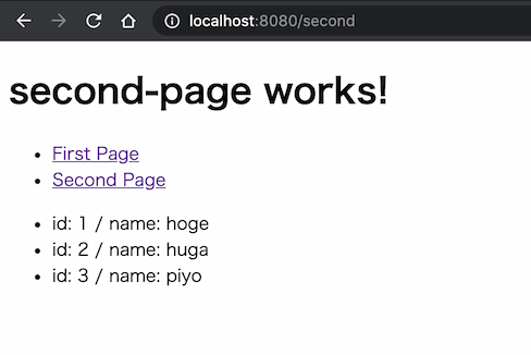 </ul>first-pageの時と同じくsecond-pageにアクセスし、画像のように表示されればOK。